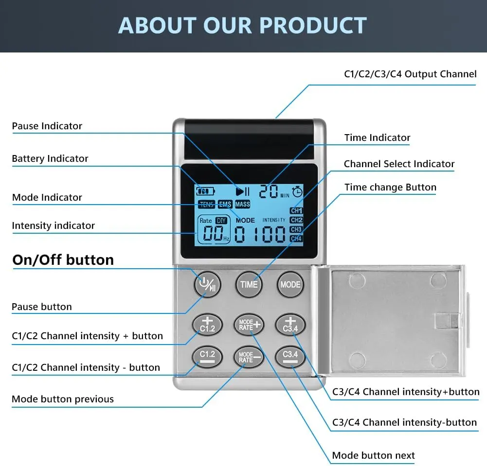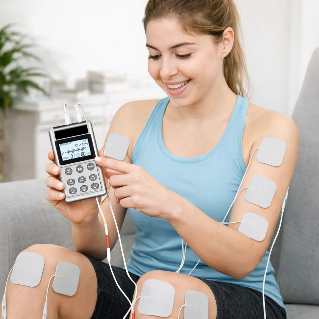 Dispozitivul transmite impulsuri electrice controlate prin electrozi aplicați pe piele, stimulând nervii și mușchii pentru a reduce durerea și a îmbunătăți funcția musculară. Această tehnologie este utilizată frecvent în fizioterapie pentru recuperare și relaxare.