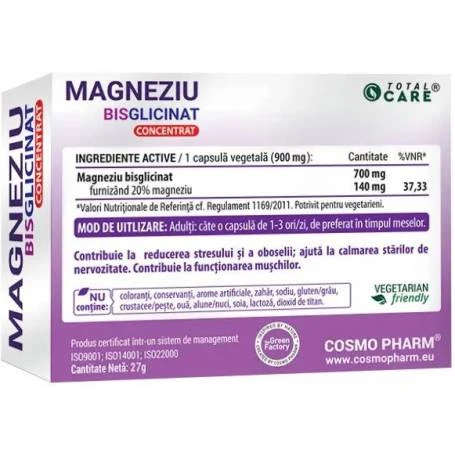 • Magneziu Bisglicinat – 700 mg (furnizând 140 mg magneziu – 20% din compoziție).