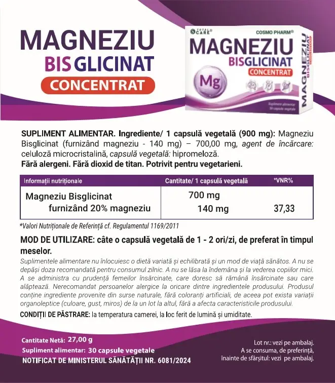Magneziul este un mineral esențial pentru sănătatea organismului, implicat în peste 300 de procese enzimatice vitale. Printre multiplele sale forme, magneziul bisglicinat se remarcă prin biodisponibilitate ridicată, fiind ușor absorbit de organism și delicat pentru sistemul digestiv. Această formulă concentrată  oferă un aport optim de magneziu, contribuind la susținerea funcțiilor neurologice, musculare și metabolice.