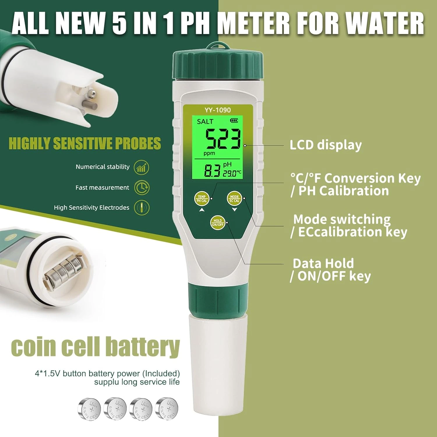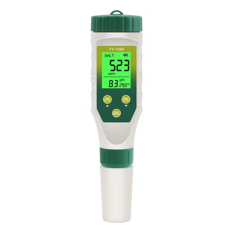 - Conveniență: Un singur dispozitiv pentru măsurarea TDS, pH, EC, salinitate și temperatură.