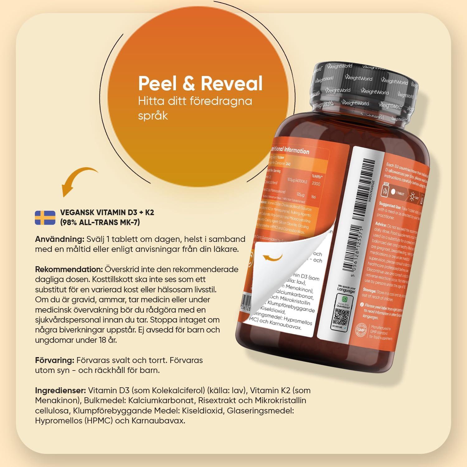 Обеспечивает оптимальное усвоение кальция и защищает здоровье костей, зубов и мышц благодаря витамину D3 4000 МЕ и витамину K2 MK7 125 мкг в веганской формуле без глютена и ГМО
